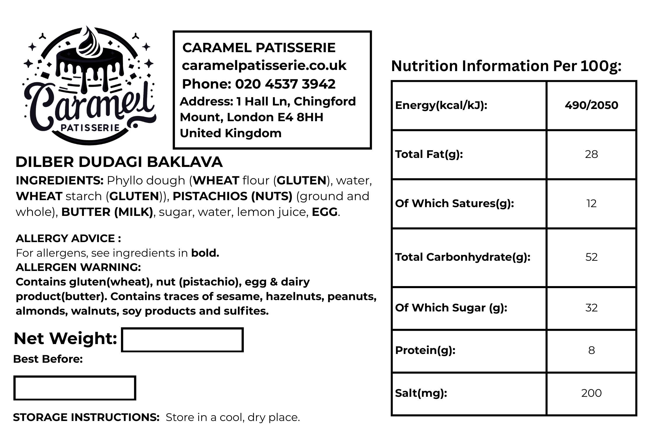 Caramel Patisserie proudly presents Dilber Dudağı Baklava, a charming and elegant dessert that holds a special place in traditional Turkish pastry culture. Translating to “Lady’s Lips Baklava,” this delicacy is as delightful to look at as it is to taste, with its signature crescent shape and rich, pistachio filling. Each piece is carefully handcrafted using ultra-thin layers of buttery phyllo dough, shaped into its distinctive “lip-like” curve. Inside, you’ll find a generous filling of finely ground premium pistachios, offering a perfect balance of crunch and natural sweetness. After baking to a beautiful golden hue, Dilber Dudağı is delicately soaked in natural syrup, making each bite melt effortlessly in your mouth.